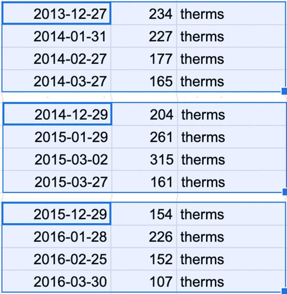Three winters’ worth of heating use from our old gas bills. Note the outliers of early 2015, which reflect our gas use during the snowiest five weeks in Boston’s history. (A therm, by the way, is a measure of energy use equal to 100,000 BTUs, or British Thermal Units.)