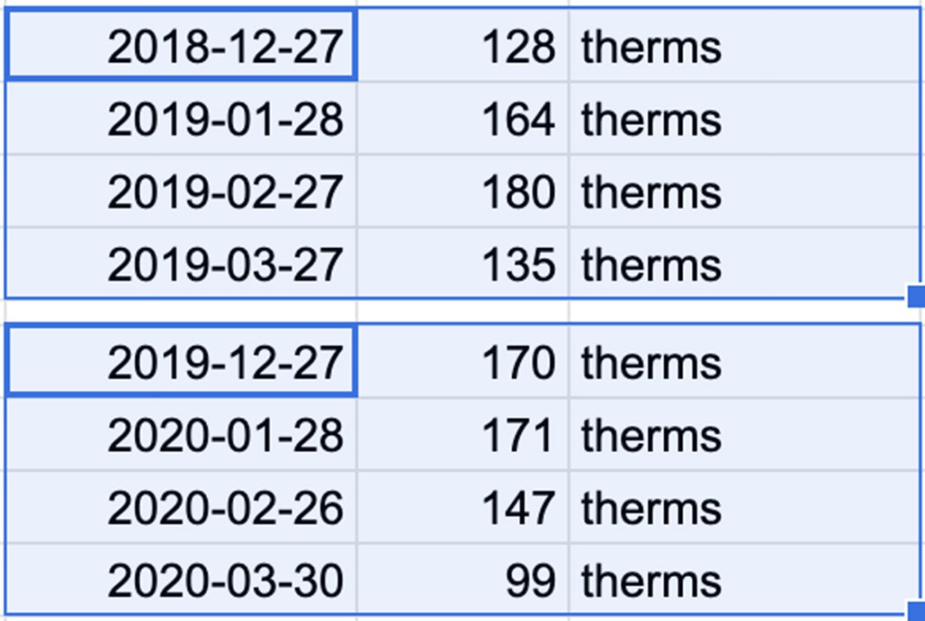 In 2013, we got a new natural gas boiler installed. For the next five years, we averaged about 190 therms per month in winter (December through March). The most we ever used was during the snowpocalypse that was Feb. 2015.